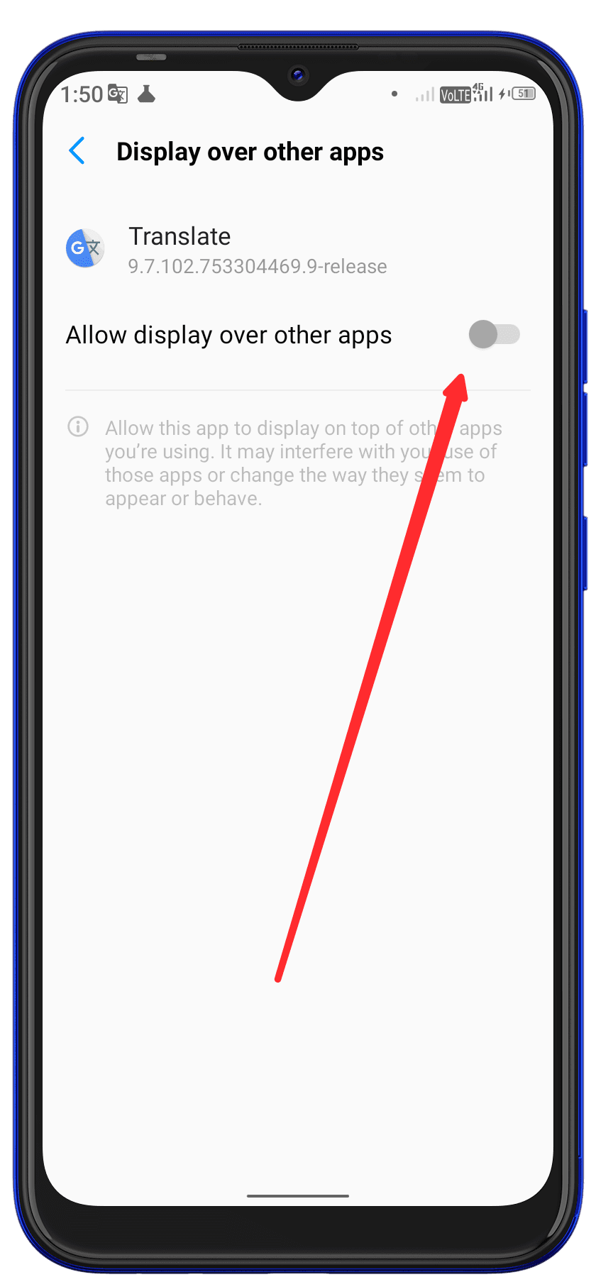 - Manage Permission पर क्लिक करने के बाद फिर से एक Next पेज लोड होगा, तुरंत आप यहां आ जाएंगे यहां पर भी आपको एक सेटिंग Enable करना है, इनेबल करने के लिए आप allow display over other apps enable setting पर क्लिक करें।